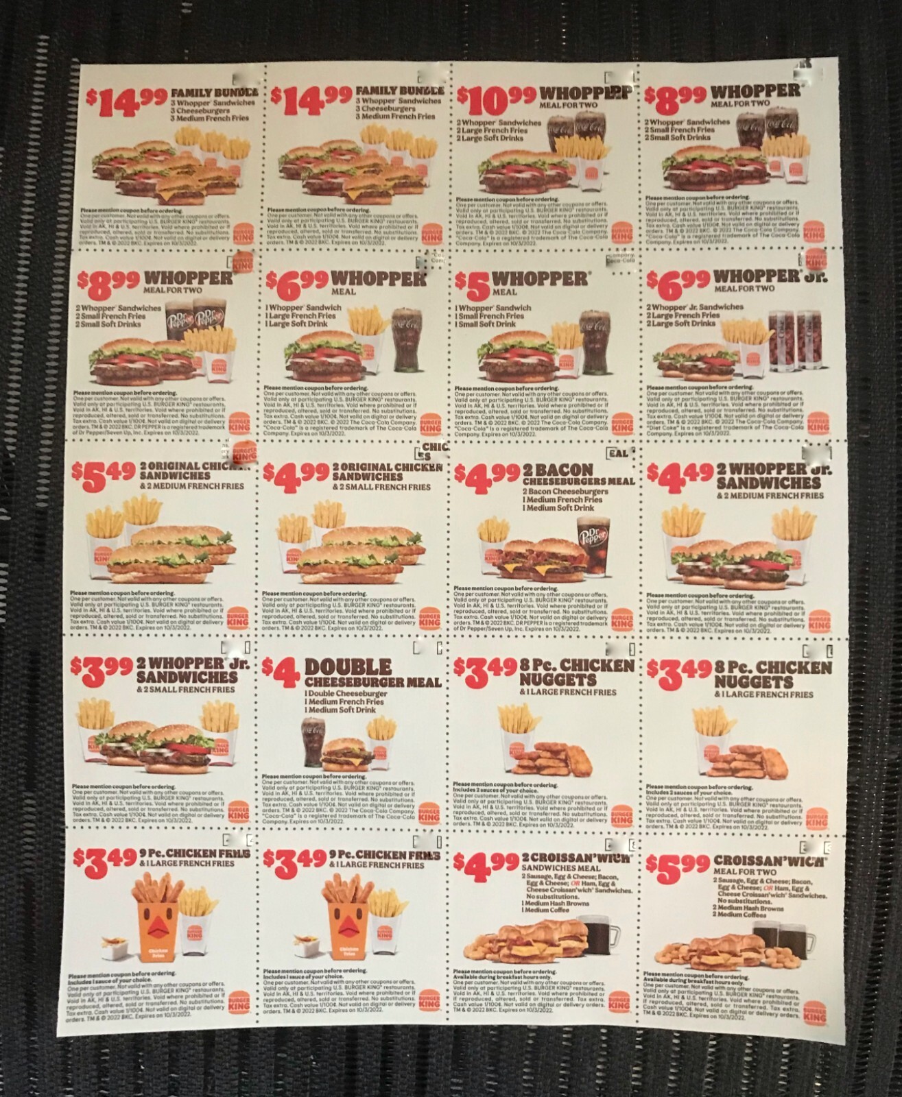 Burger King Deals & Coupons - Ultimate List For October 2022 - Savewall In-Store Coupon Codes $5 2 Croissan'wich Meal (2 sausages or ham Croissan'which, 1 small hash browns, 1 small coffee) 4857 $4.99 2 Original Chicken Sandwiches & 2 Small Fries 1427 $3.99 2 Whoppers Jr. & 2 Small French Fries 3945 Available in stores only. Save the 4-digit codes mentioned above.